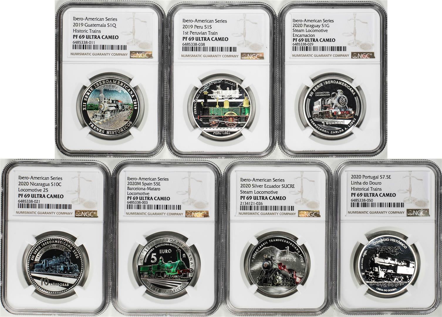 One Set of 2019-2020 Ibero-American Historic Train (7) Silver Coins NGC PF69 Ultra Cameo. NGC Certified.