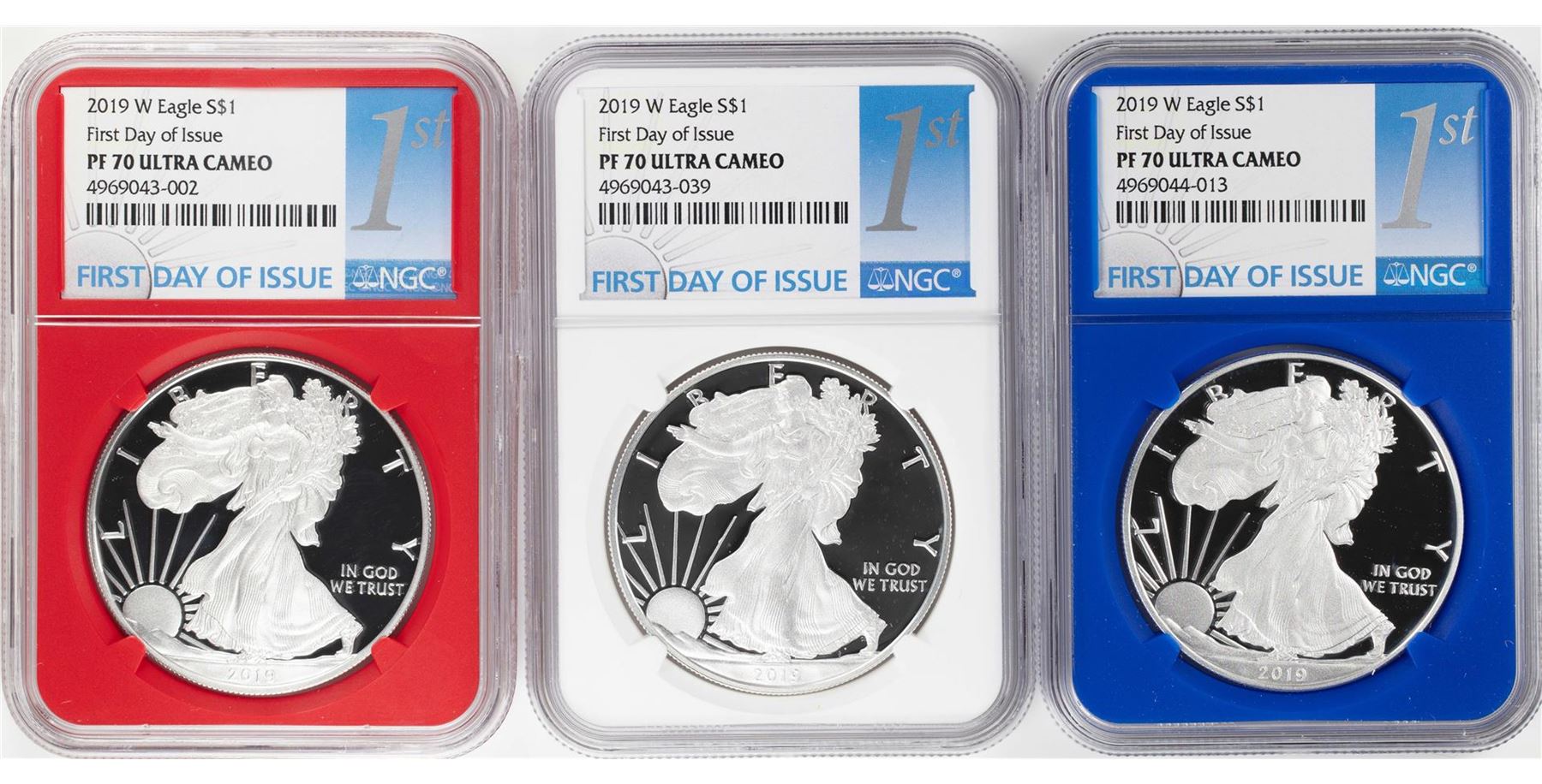 One Set of 2019-W $1 Proof American Silver Eagle Coins NGC PF70 Ultra Cameo Red White Blue. NGC Certified.