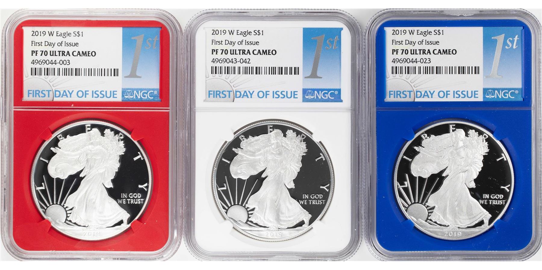 One Set of 2019-W $1 Proof American Silver Eagle Coins NGC PF70 Ultra Cameo Red White Blue. NGC Certified.
