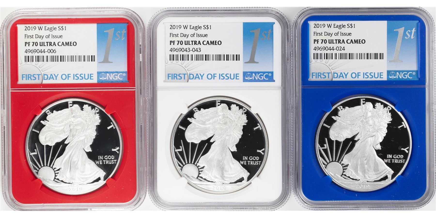 One Set of 2019-W $1 Proof American Silver Eagle Coins NGC PF70 Ultra Cameo Red White Blue. NGC Certified.