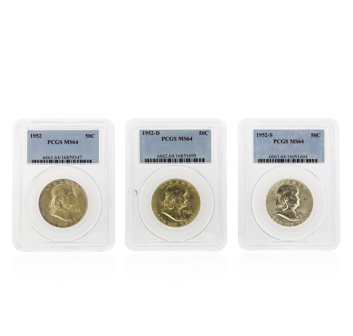 Set of (3) 1952 Franklin Half Dollar PCGS Graded Coins which includes the following (3) coins: (1) 1952 Franklin Half Dollar PCGS Graded MS64, (1) 1952-D Franklin Half Dollar PCGS Graded MS64, and (1) 1952-S Franklin Half Dollar PCGS Graded MS64. PCGS Graded.