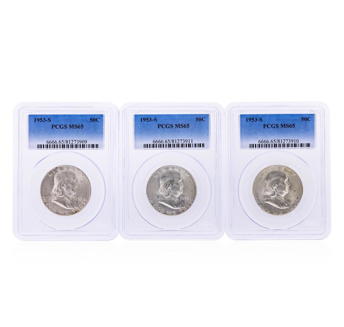 One Set of (3) 1953-S Franklin Half Dollar Coins PCGS MS65. PCGS Graded.