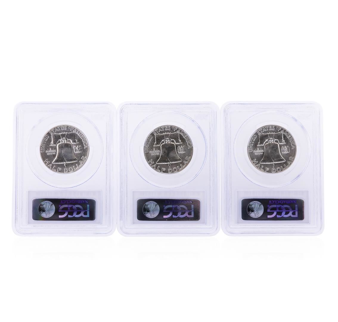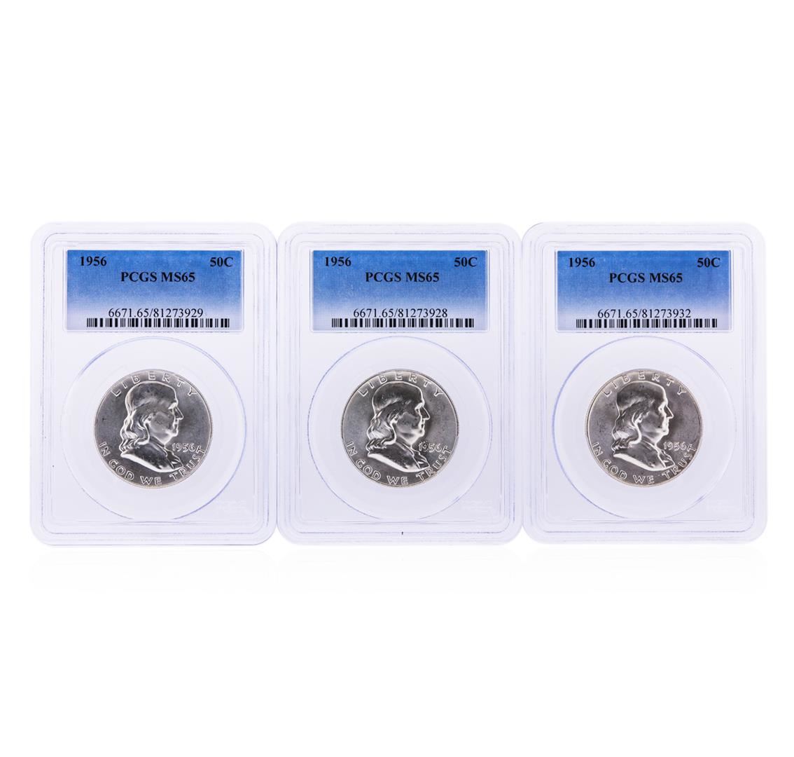 One Set of (3) 1956 Franklin Half Dollar Coins PCGS MS65. PCGS Graded.