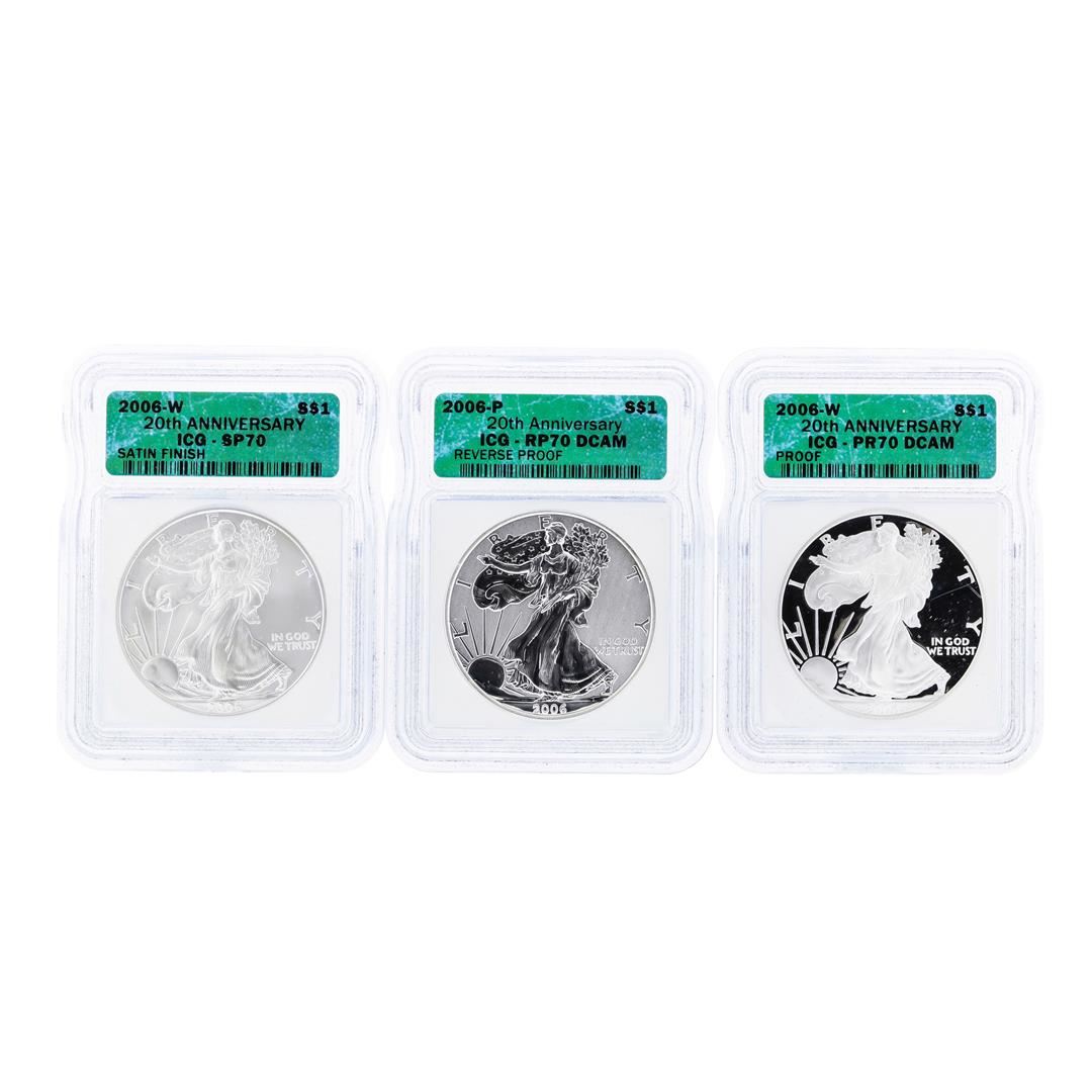 Set of (3) 2006-W $1 American Silver Eagle Proof Coins ICG Graded 70