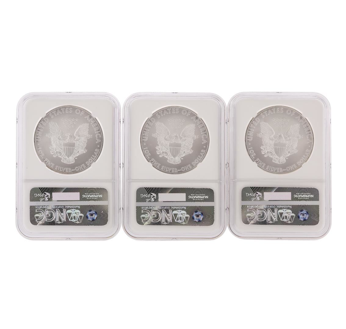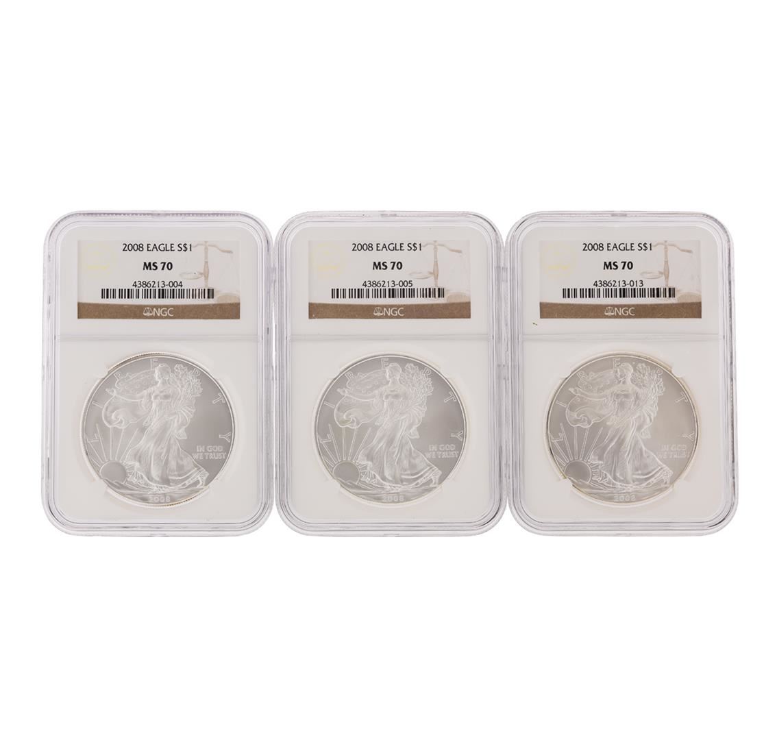 One Set of (3) 2008 $1 American Silver Eagle Coins NGC MS70. NGC Certified.