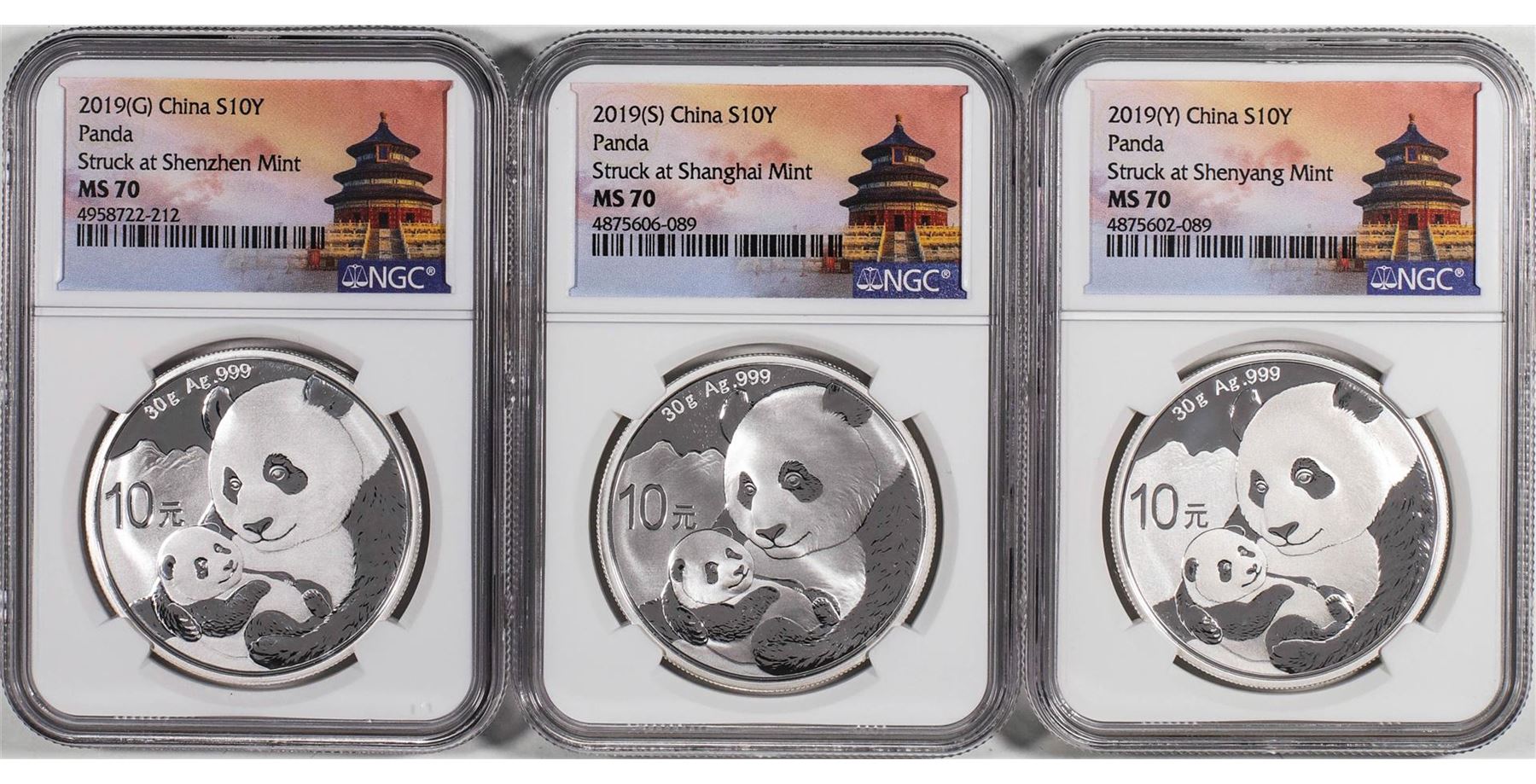 Set of (3) 2019 (G/S/Y) China 10 Yuan Silver Panda Coins NGC MS70