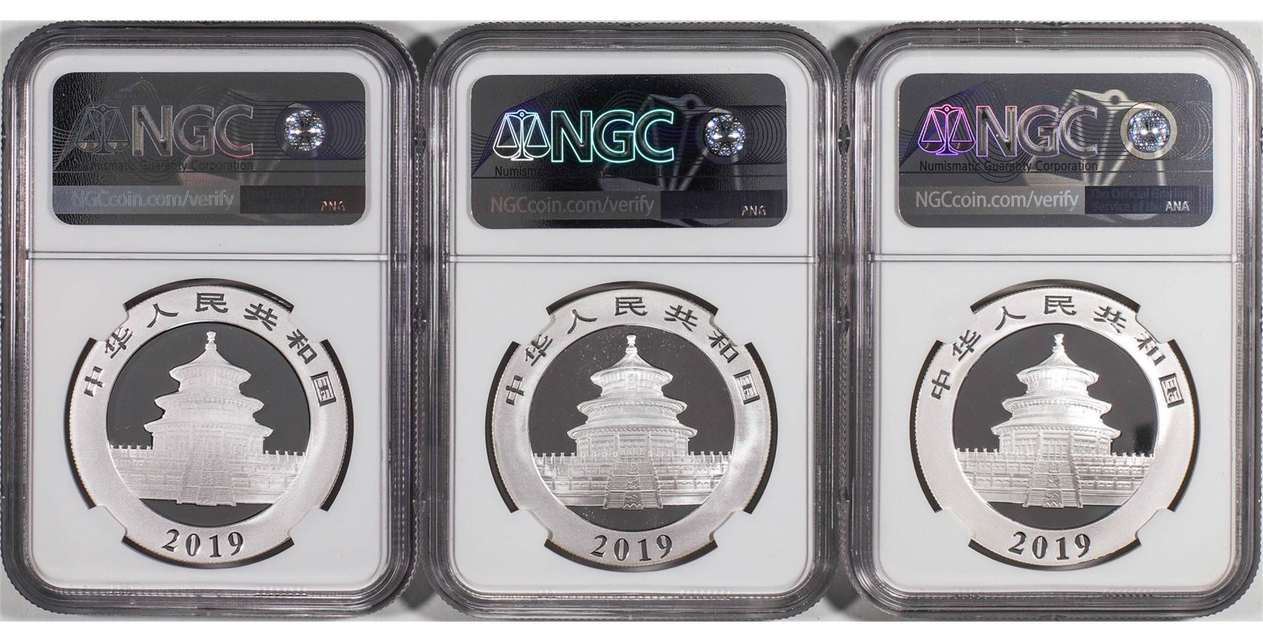 One Set of (3) 2019 (G/S/Y) China 10 Yuan Silver Panda Coins NGC MS70. NGC Certified.