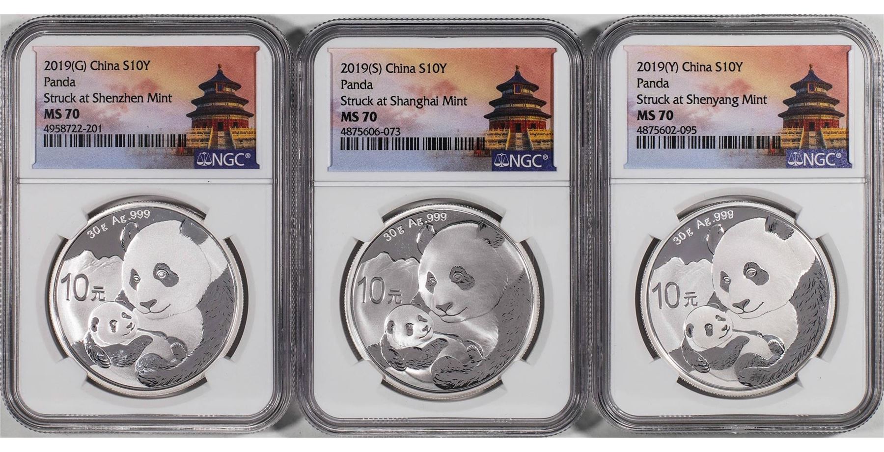 Set of (3) 2019 (G/S/Y) China 10 Yuan Silver Panda Coins NGC MS70