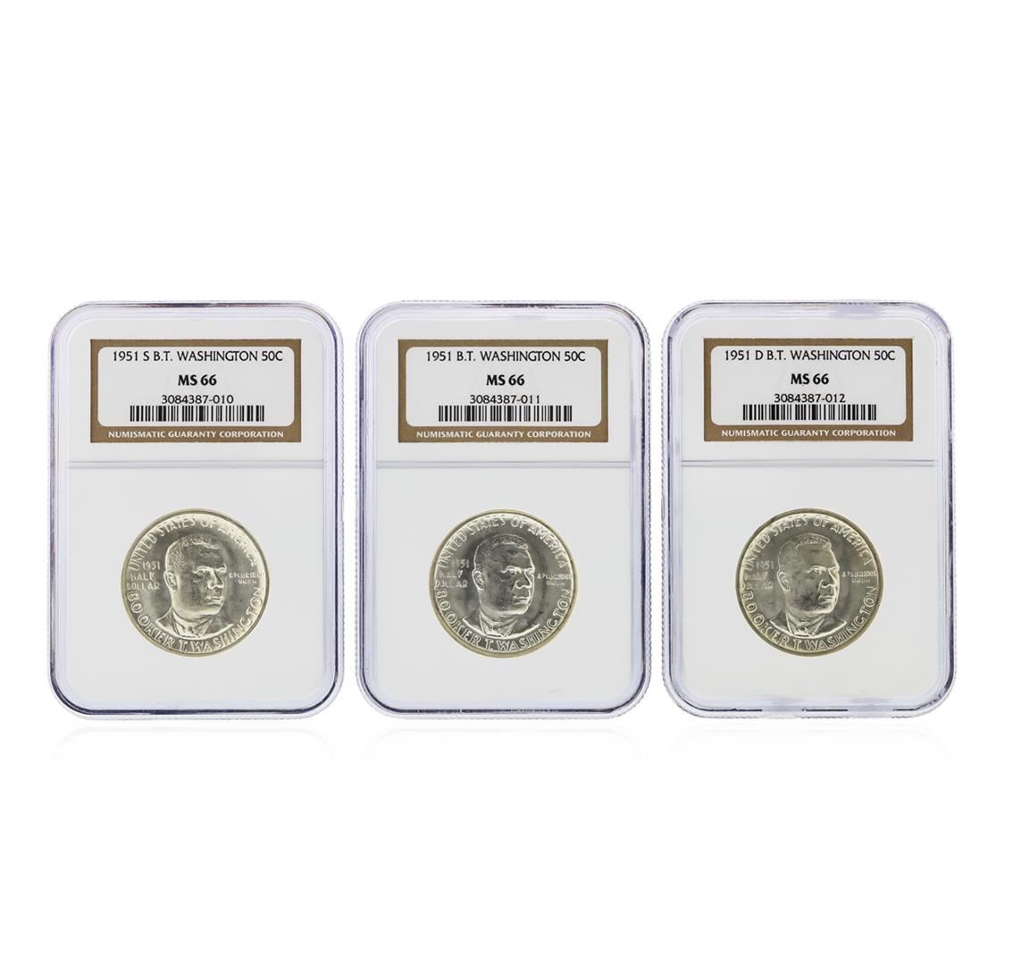 This set includes (3) Booker T. Washington Memorial Commemorative Half Dollar Coins including: 1951, 1951-S, and 1951-D NGC Graded MS66 Coins. NGC Certified.