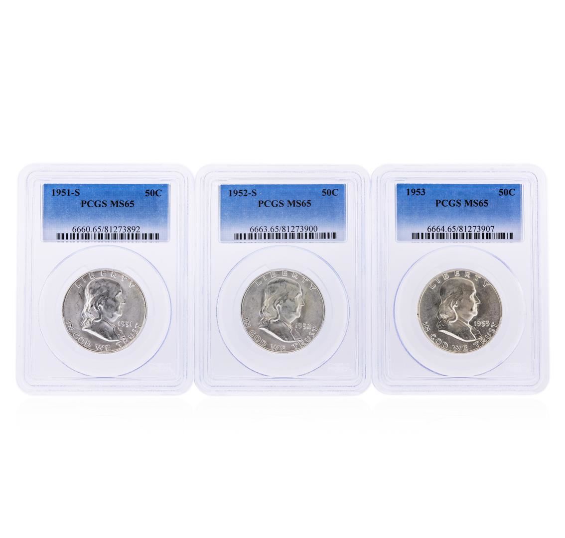 Set of (3) Franklin Half Dollar PCGS Graded Coins which includes the following (3) coins: (1) 1951-S Franklin Half Dollar PCGS Graded MS65, (1) 1952-S Franklin Half Dollar PCGS Graded MS65, and (1) 1953 Franklin Half Dollar PCGS Graded MS65. PCGS Graded.