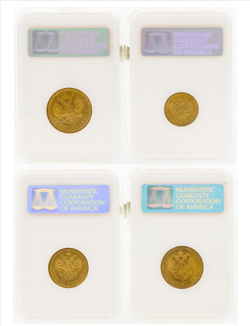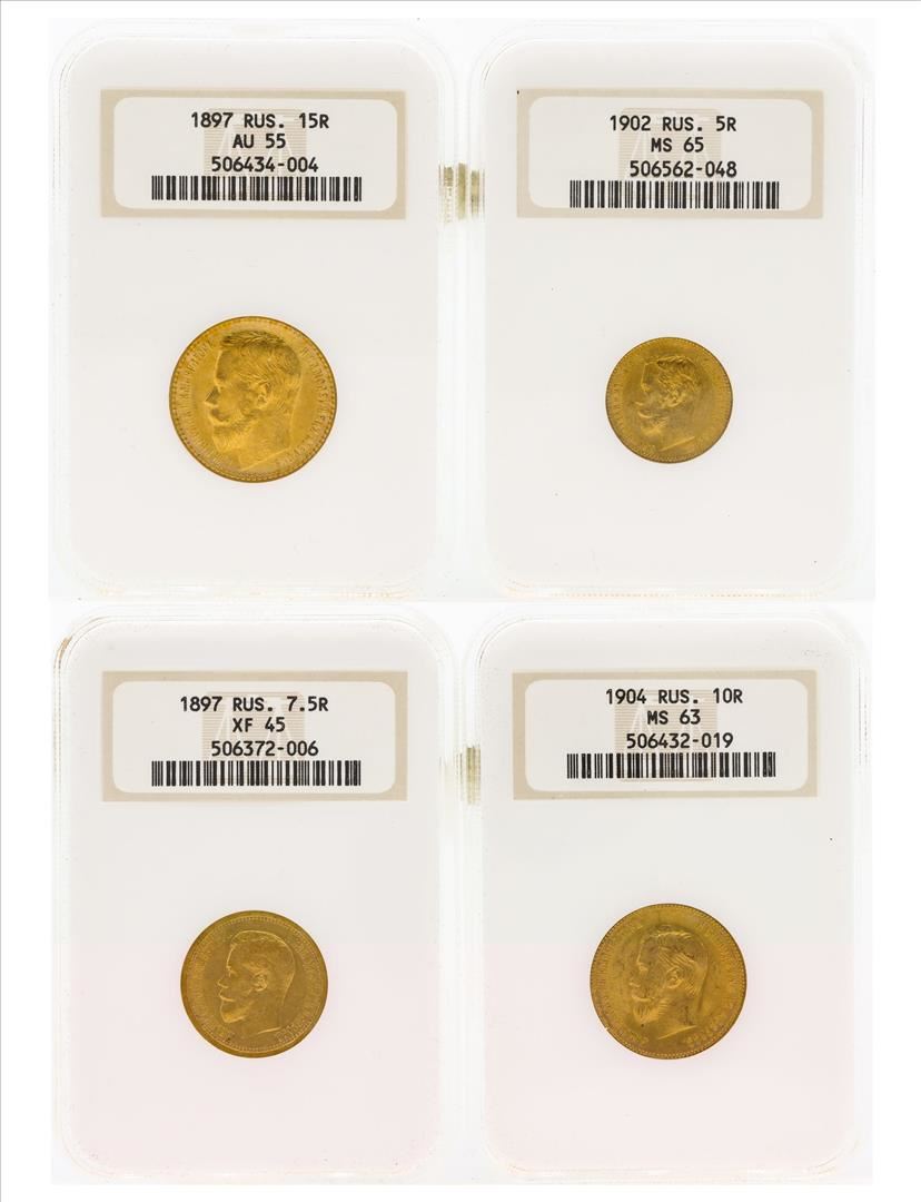 One Set of (4) 1897-1904 Russian Roubles Gold Coins NGC Graded. The set includes the following coins: 1902 Russian 5 Roubles Gold Coin NGC MS65, 1897 Russian 7.5 Roubles Gold Coin NGC XF45, 1904 Russian 10 Roubles Gold Coin NGC MS63, 1897 Russian 15 Roubles Gold Coin NGC AU55. NGC Certified.