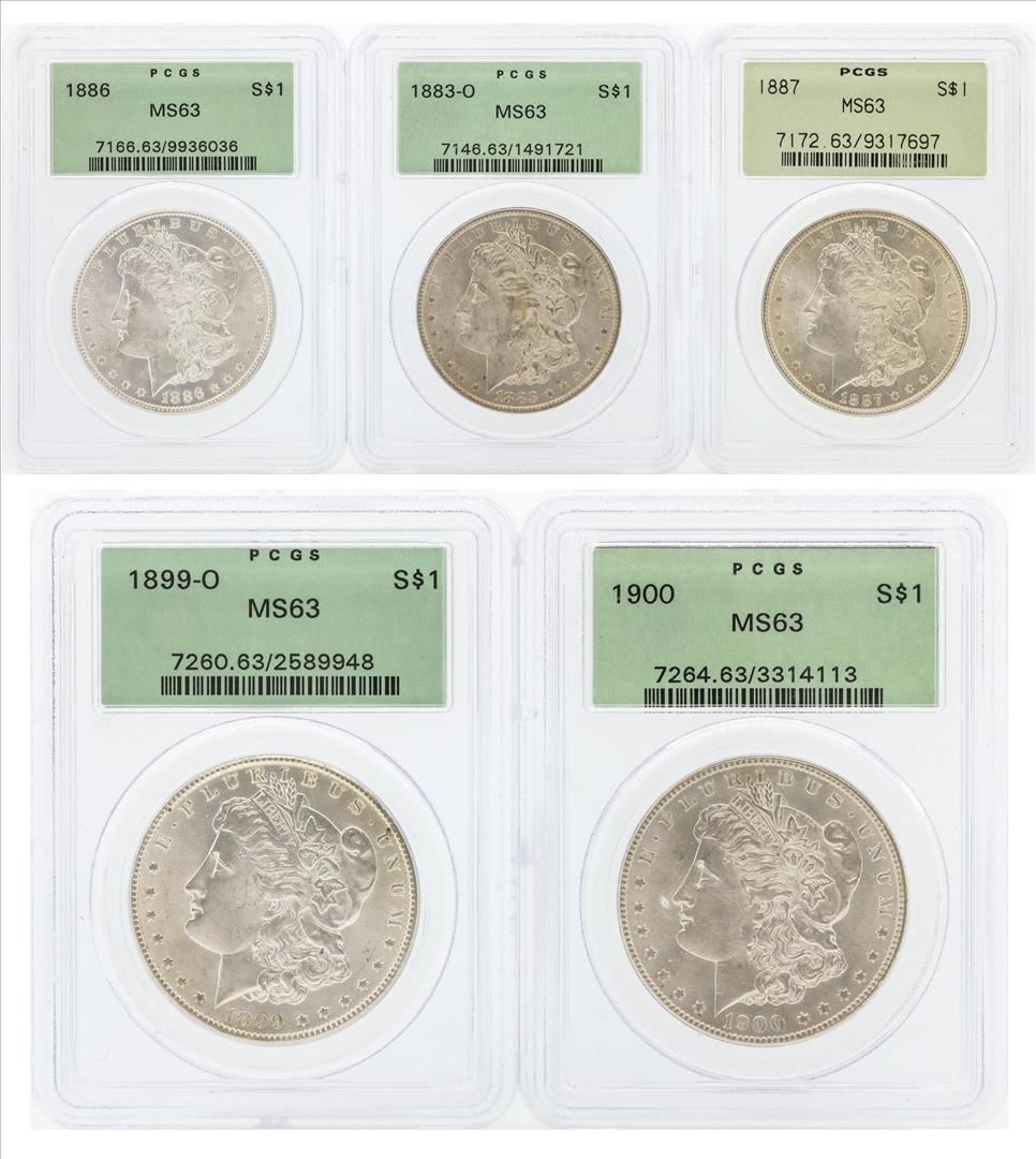 One Set of (5) $1 Morgan Silver Dollar Coins PCGS MS63 Green Holders. PCGS Graded.