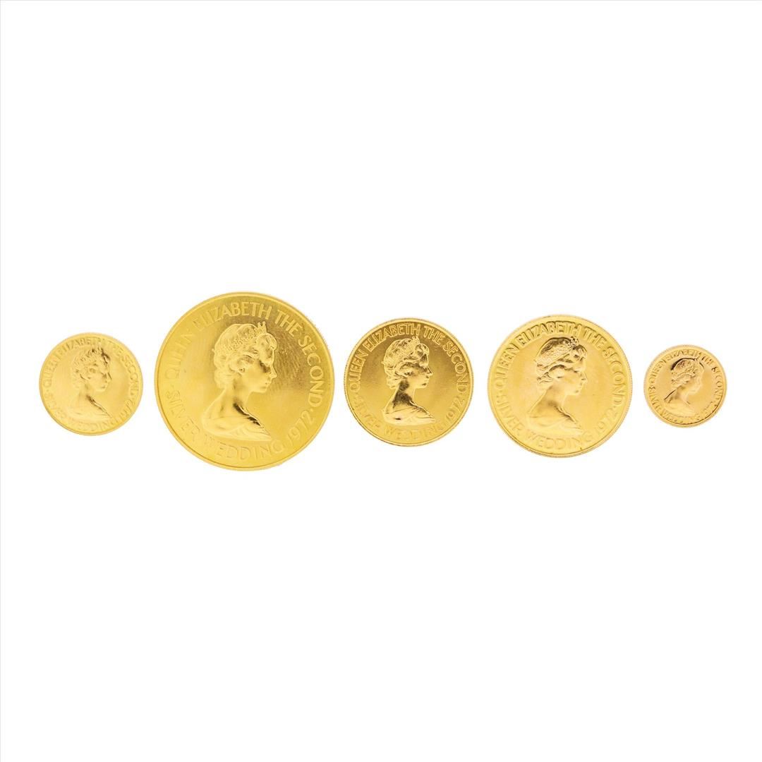 One Set of (5) 1972 Bailiwick of Jersey Gold Coins. (1) five pound gold coin, (1) ten pound gold coin, (1) twenty pound gold coin, (1) twenty five pound gold coin, and (1) fifty pound gold coin.