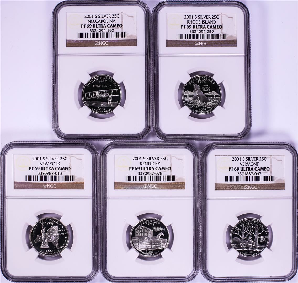 One Set of (5) 2001-S Silver Proof State Quarter Coins NGC PF69 Ultra Cameo. NGC Certified.
