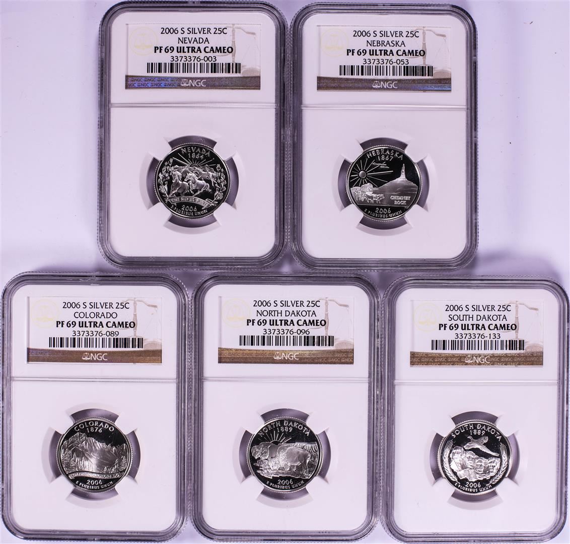One Set of (5) 2006-S Silver Proof State Quarter Coins NGC PF69 Ultra Cameo. NGC Certified.