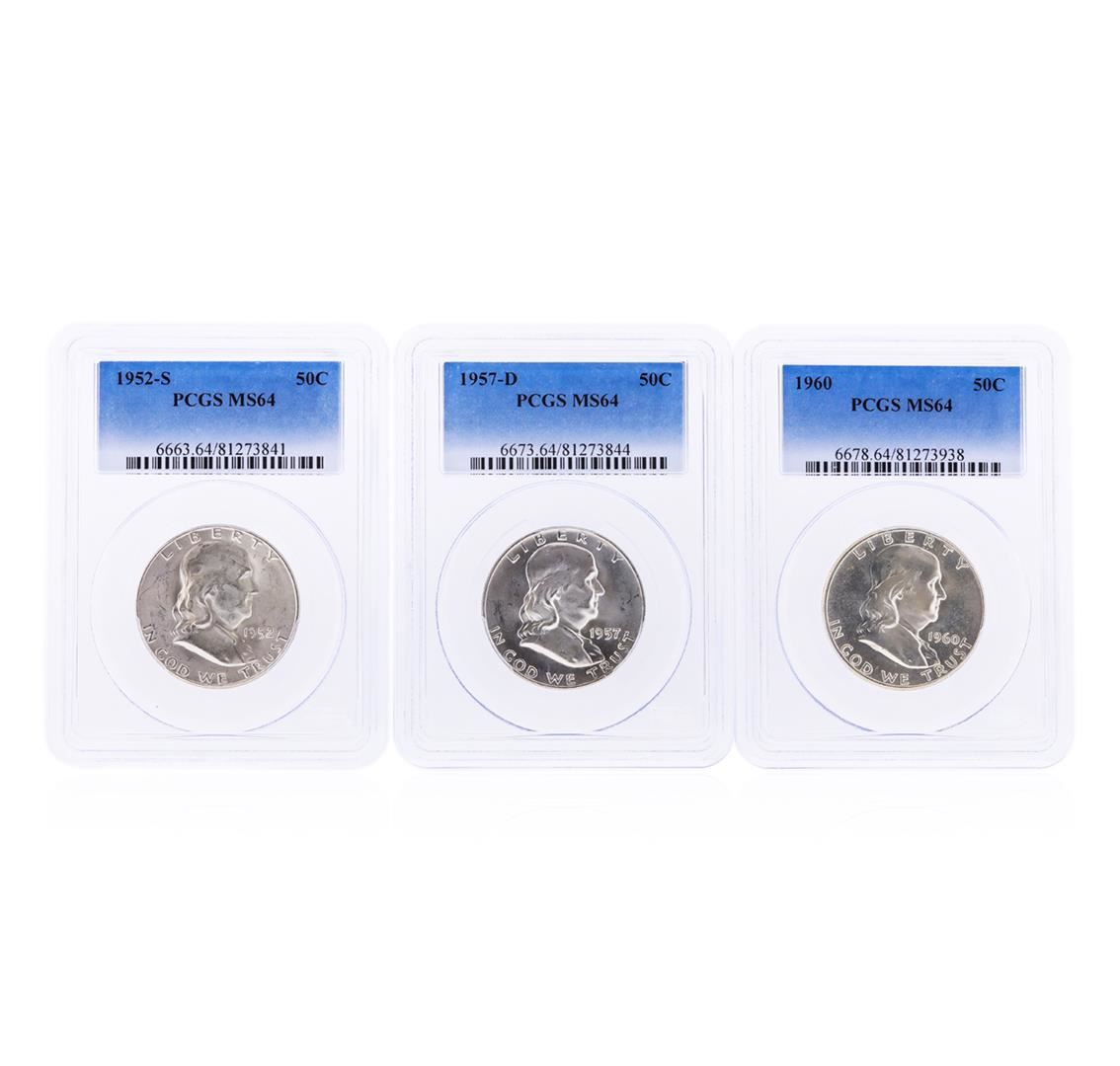 Set of (5) Franklin Half Dollar PCGS Graded Coins which includes the following (3) coins: (1) 1952-S Franklin Half Dollar PCGS Graded MS64, (1) 1957-D Franklin Half Dollar PCGS Graded MS64, (1) 1960 Franklin Half Dollar PCGS Graded MS64, (1) 1963 Franklin PCGS Graded.