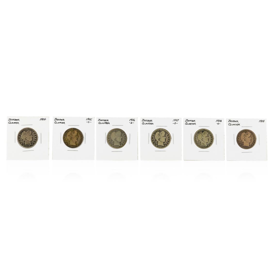 One set of (4) Silver Barber Quarters including the following dates: 1904, 1905-S, 1906-D, 1907-D, 1908-D, and 1909.