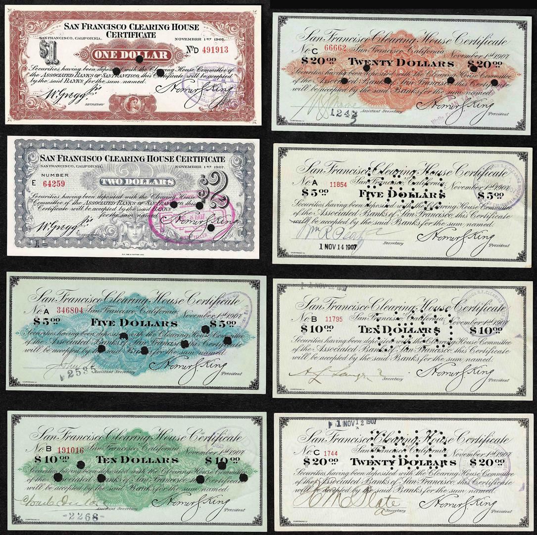 One Set of (8) 1907 San Francisco Clearing House Stock Certificates.