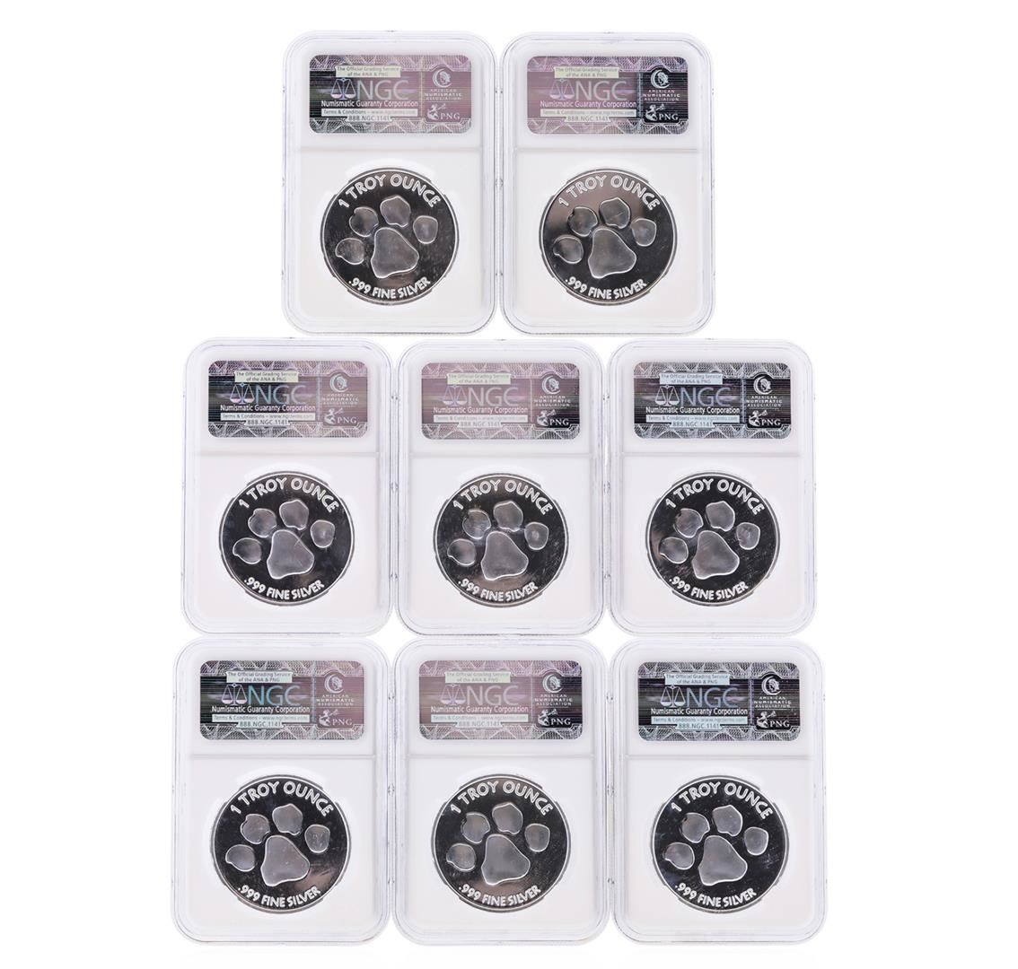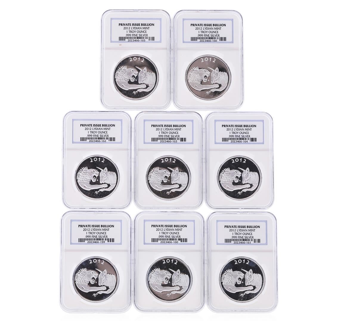 One Set of (8) 2012 Lydian Mint .999 Silver 1 Troy Ounce Coins NGC Certified. NGC Certified.