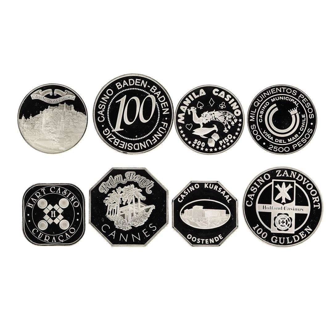 One Set of (8) Assorted World Famous Silver Casino Chips.