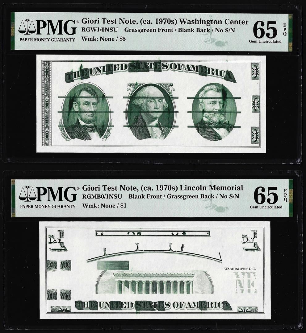 One Set of Giori Test Note Washington & Lincoln Memorial PMG Gem Uncirculated 65EPQ. PMG Certified.