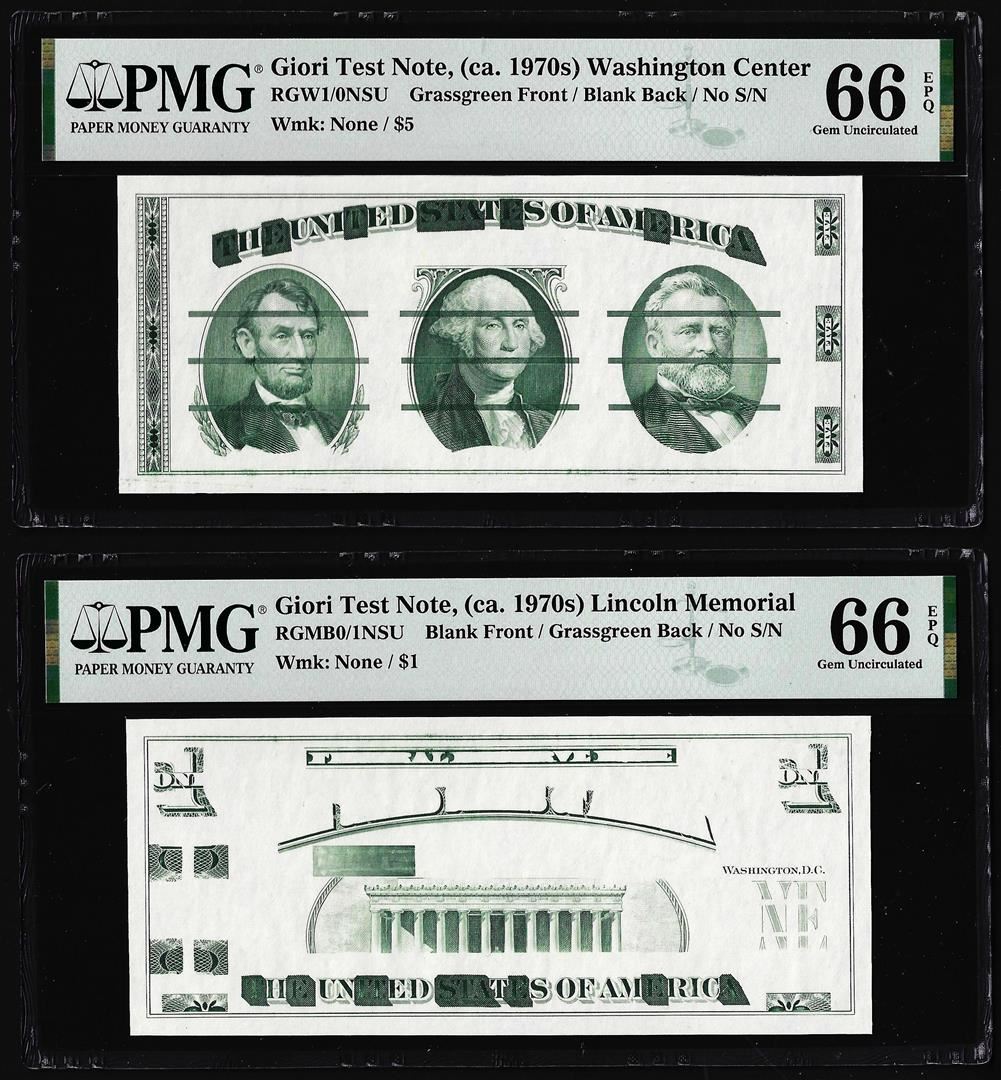 One Set of Giori Test Note Washington & Lincoln Memorial PMG Gem Uncirculated 66EPQ. PMG Certified.