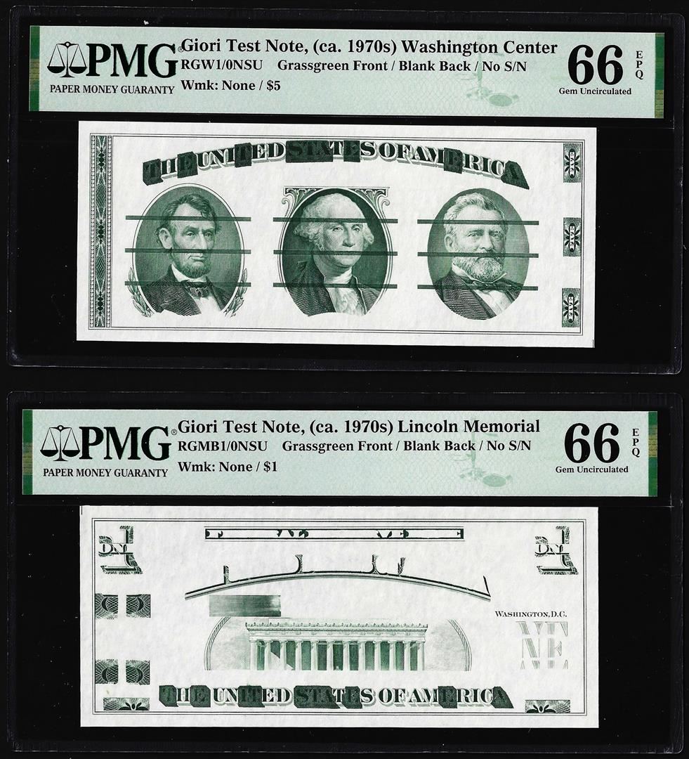 One Set of Giori Test Note Washington & Lincoln Memorial PMG Gem Uncirculated 66EPQ. PMG Certified.