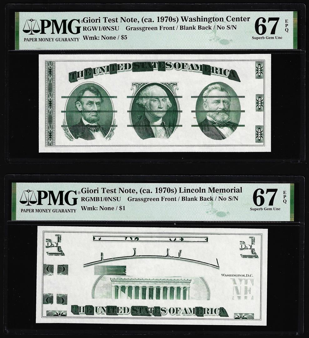 Set of Giori Test Note Washington & Lincoln Memorial PMG Superb Gem Unc 67EPQ