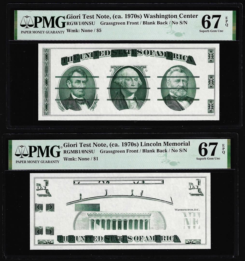 One Set of Giori Test Note Washington & Lincoln Memorial PMG Superb Gem Unc 67EPQ. PMG Certified.