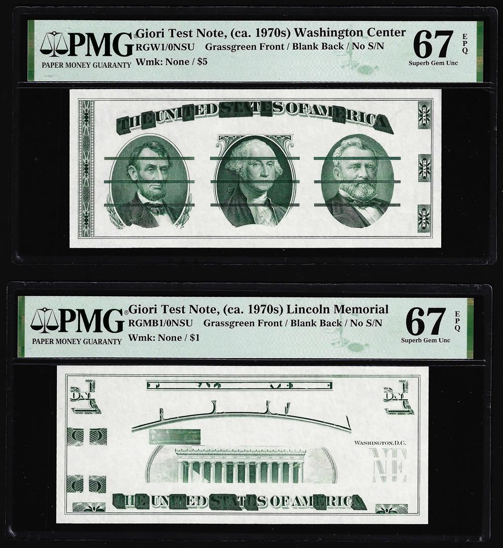 One Set of Giori Test Note Washington & Lincoln Memorial PMG Superb Gem Unc 67EPQ. PMG Certified.