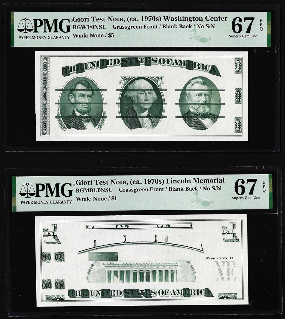 One Set of Giori Test Note Washington & Lincoln Memorial PMG Superb Gem Unc 67EPQ. PMG Certified.