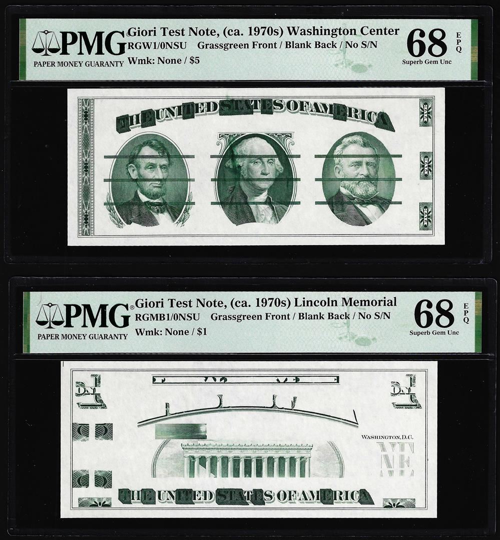 One Set of Giori Test Note Washington & Lincoln Memorial PMG Superb Gem Unc 68EPQ. PMG Certified.
