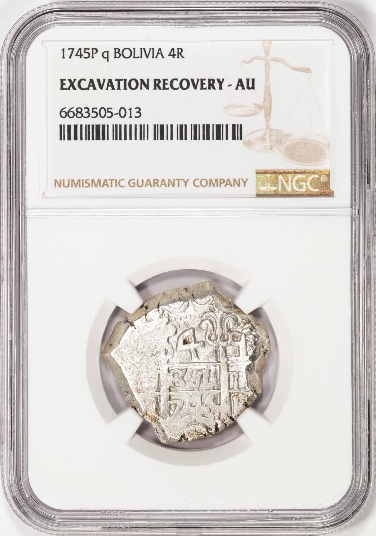 Shipwreck 1745P q Bolivia 4 Reales Silver Coin NGC AU Excavation Recovery