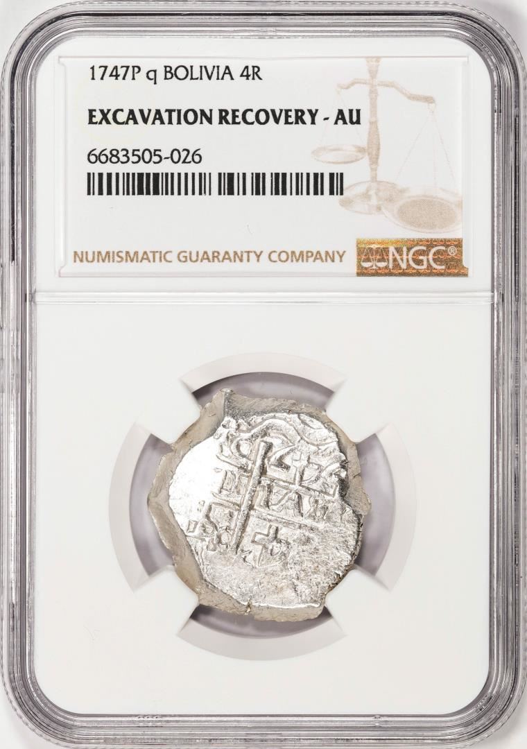 Shipwreck 1747P q Bolivia 4 Reales Silver Coin NGC AU Excavation Recovery