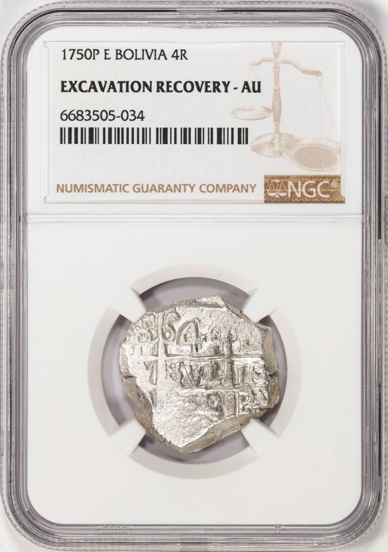 Shipwreck 1750P E Bolivia 4 Reales Silver Coin NGC AU Excavation Recovery