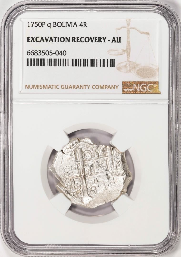 Shipwreck 1750P q Bolivia 4 Reales Silver Coin NGC AU Excavation Recovery