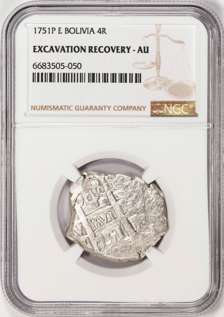 Shipwreck 1751P E Bolivia 4 Reales Silver Coin NGC AU Excavation Recovery