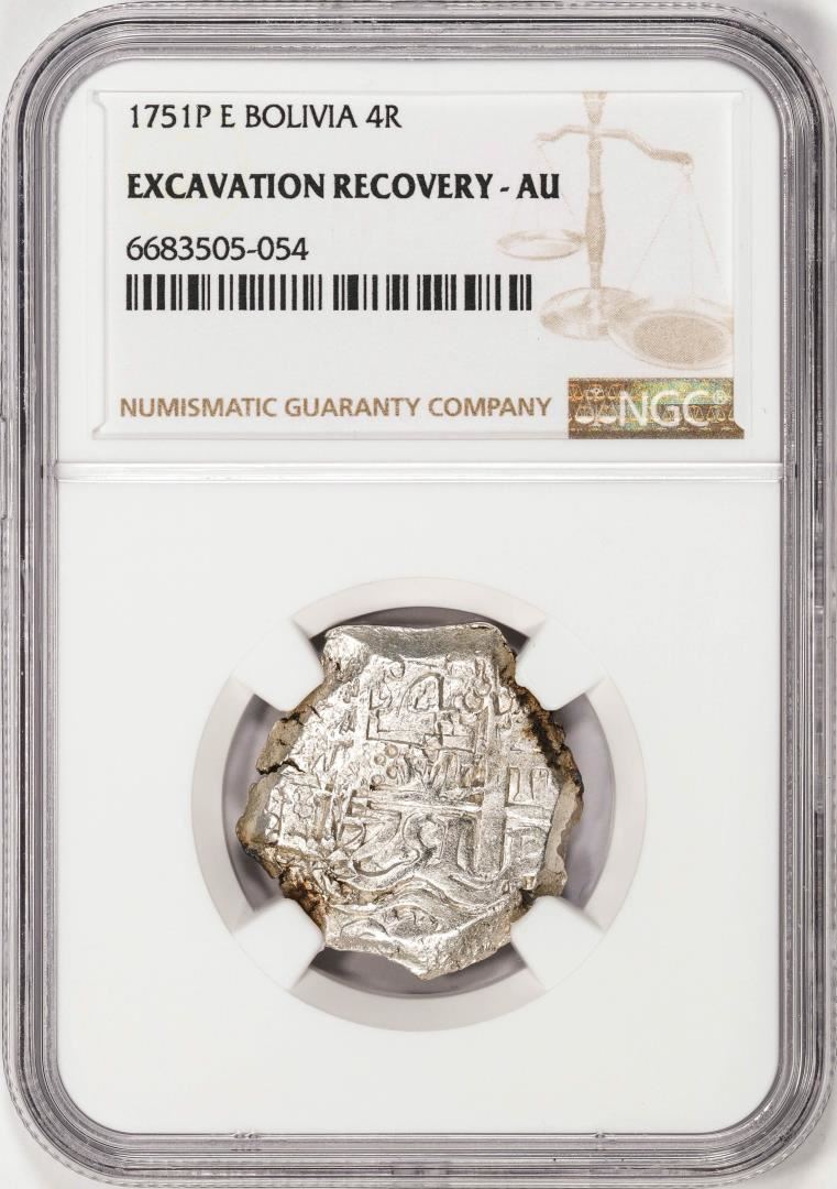 Shipwreck 1751P E Bolivia 4 Reales Silver Coin NGC AU Excavation Recovery