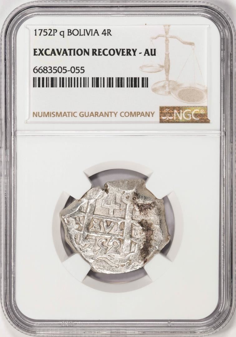 Shipwreck 1752P q Bolivia 4 Reales Silver Coin NGC AU Excavation Recovery