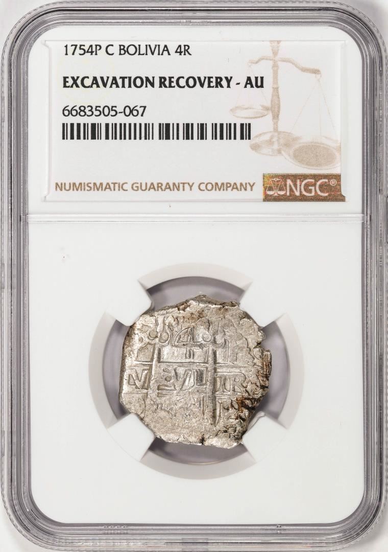 Shipwreck 1754P C Bolivia 4 Reales Silver Coin NGC AU Excavation Recovery