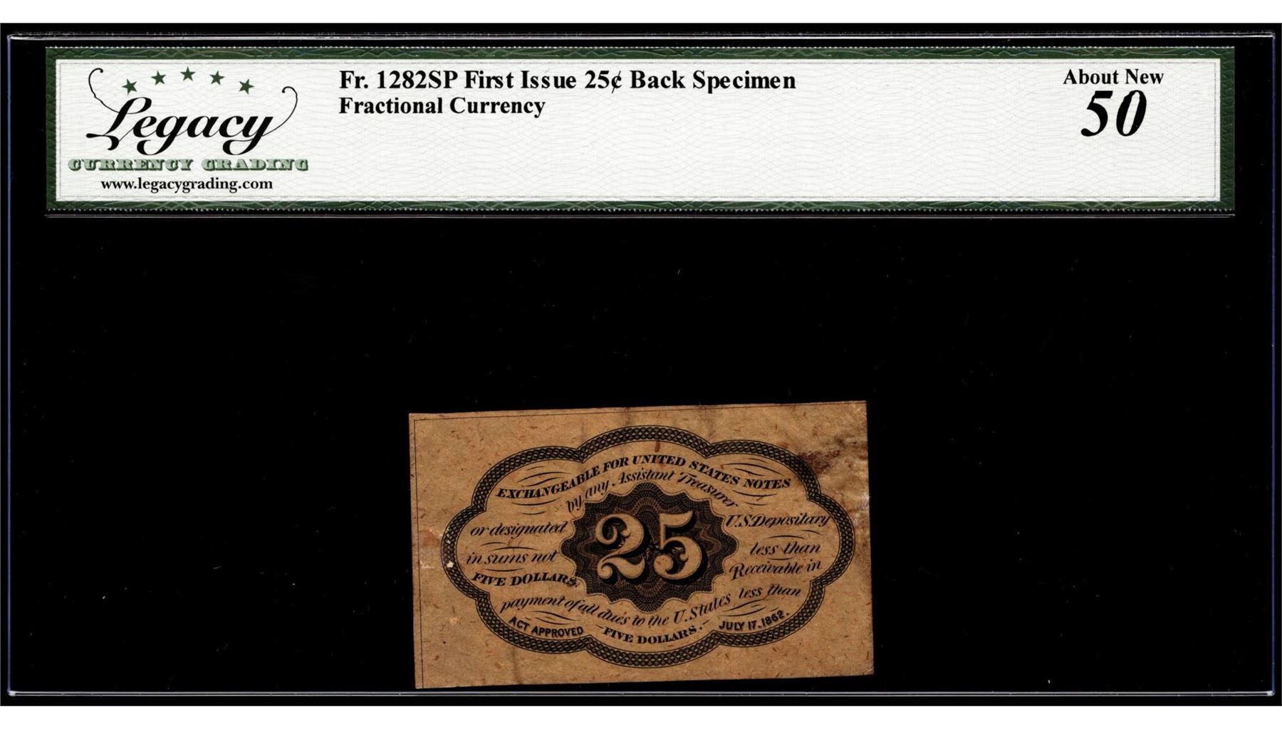 One Specimen First Issue 25 Cents Fractional Currency Note Fr.1282SP Legacy About New 50. Legacy Graded.