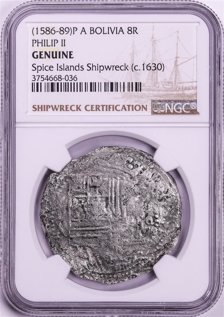 One Spice Islands Shipwreck (1586-89) Bolivia 8 Reales Philip II Silver Coin NGC Genuine. NGC Certified.