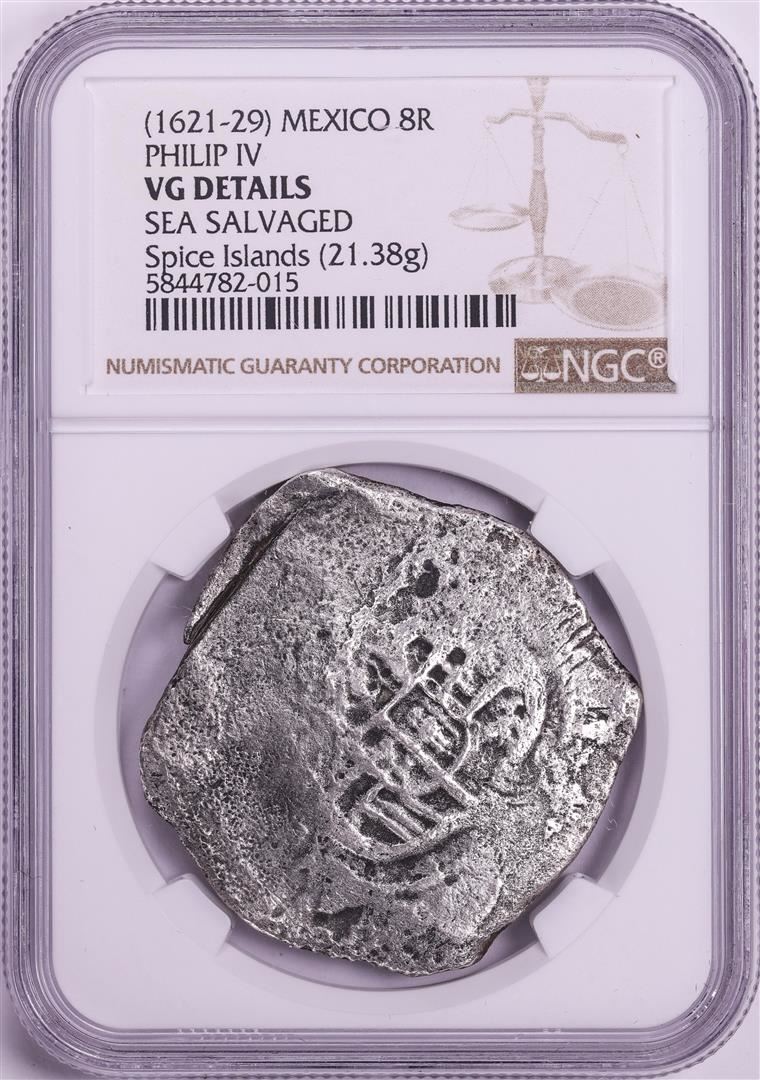 One Spice Islands Shipwreck (1621-29)MO Mexico 8 Reales Philip IV Silver Coin NGC Graded. NGC Certified.