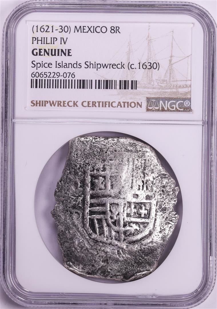 One Spice Islands Shipwreck (1621-30)MO Mexico 8 Reales Philip IV Silver Coin NGC Genuine. NGC Certified.