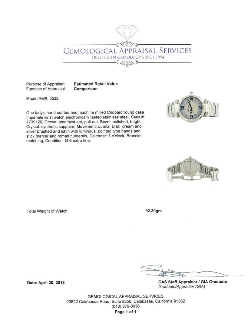 One Ladies, hand crafted and machine milled Chopard round case Imperiale wrist watch electronically tested stainless steel, Serial#: 1739120, Crown: amethyst-set, pull-out, Bezel: polished, bright, Crystal: synthetic sapphire, Movement: quartz, Dial: cream and silver brushed and satin with luminous, pointed type hands and stick marker and roman numerals, Calendar: 3 o'clock, Bracelet: matching, Condition: G-6 extra fine.. Total Weight of Watch 92.30gm. GAS Appraised.