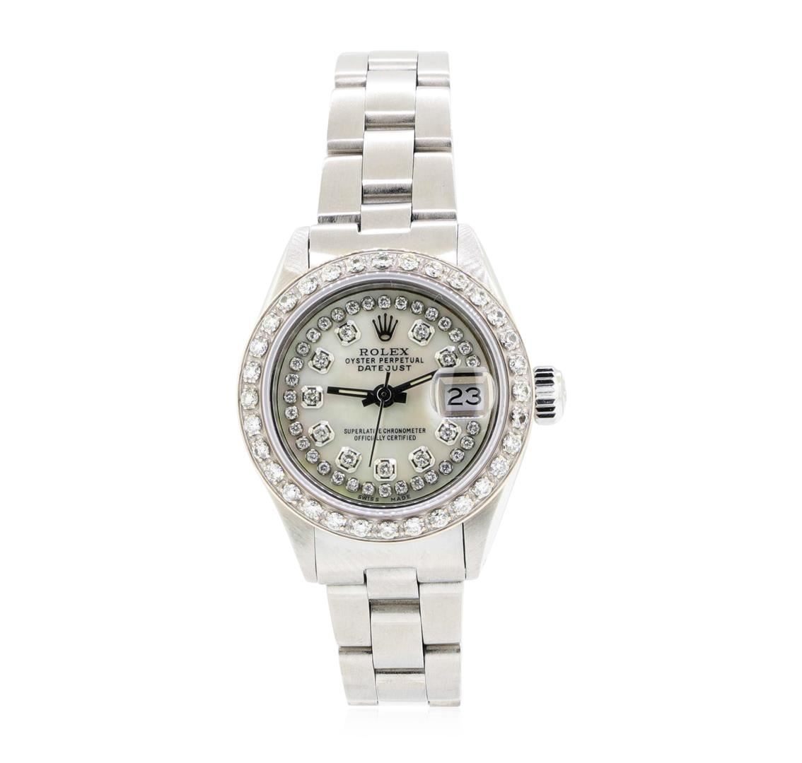 One Ladies, hand crafted and machine milled Rolex round case oyster perpetual datejust wrist watch electronically tested stainless steel, Serial#: 3723670, Crown: screw-down, Bezel: custom, diamond set, Crystal: custom, synthetic sapphire with cyclops lens, Movement: superlative chronometer, Dial: custom mother of pearl with baton, pointed type hands and diamond marker numerals, Circa: 1974, Calendar: 3 o'clock, Bracelet: matching, Condition: G-4 average. In addition to diamond marker numerals, the featured wristwatch features a string of diamonds circling the face. Containing: Thirty-Two prong set round brilliant cut diamonds, measuring 1.80 - 1.80 x 1.12mm (depth est.) approximate total weight of 32 Stones = 0.70ct. Graded in the setting. Color G - H Clarity VS-1 to VS-2 Cut Very Good. Total Weight of Diamonds 0.70ct.. Total Weight of Watch 54.30gm. GAS Appraised.
