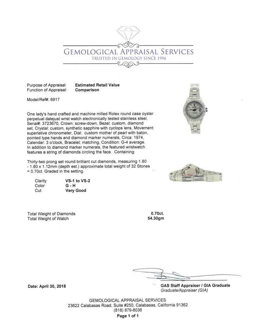 One Ladies, hand crafted and machine milled Rolex round case oyster perpetual datejust wrist watch electronically tested stainless steel, Serial#: 3723670, Crown: screw-down, Bezel: custom, diamond set, Crystal: custom, synthetic sapphire with cyclops lens, Movement: superlative chronometer, Dial: custom mother of pearl with baton, pointed type hands and diamond marker numerals, Circa: 1974, Calendar: 3 o'clock, Bracelet: matching, Condition: G-4 average. In addition to diamond marker numerals, the featured wristwatch features a string of diamonds circling the face. Containing: Thirty-Two prong set round brilliant cut diamonds, measuring 1.80 - 1.80 x 1.12mm (depth est.) approximate total weight of 32 Stones = 0.70ct. Graded in the setting. Color G - H Clarity VS-1 to VS-2 Cut Very Good. Total Weight of Diamonds 0.70ct.. Total Weight of Watch 54.30gm. GAS Appraised.