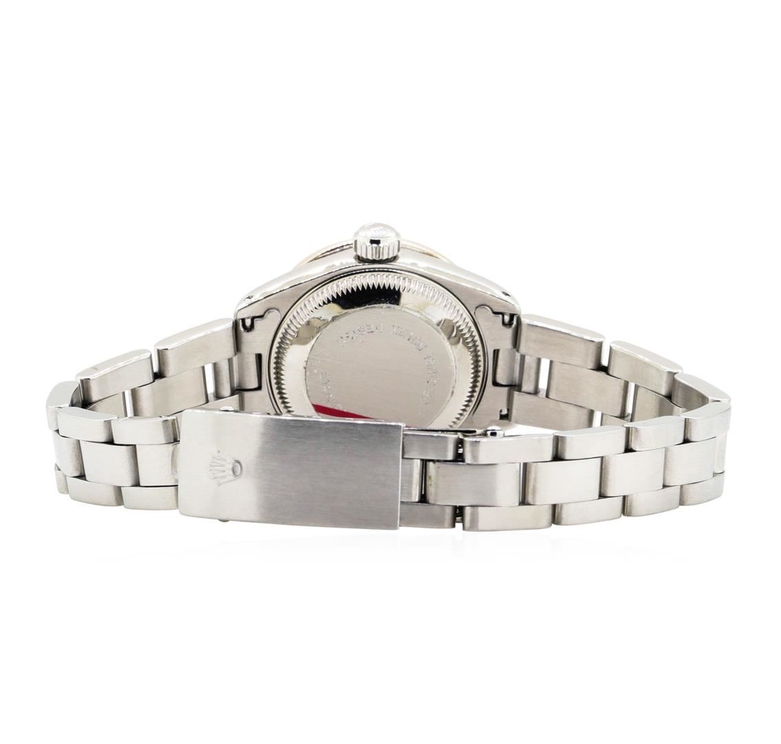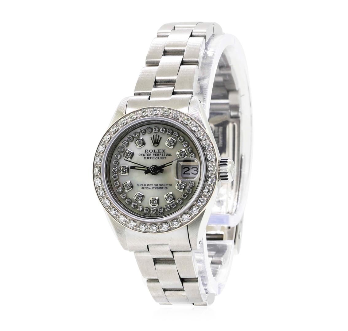 One Ladies, hand crafted and machine milled Rolex round case oyster perpetual datejust wrist watch electronically tested stainless steel, Serial#: 3723670, Crown: screw-down, Bezel: custom, diamond set, Crystal: custom, synthetic sapphire with cyclops lens, Movement: superlative chronometer, Dial: custom mother of pearl with baton, pointed type hands and diamond marker numerals, Circa: 1974, Calendar: 3 o'clock, Bracelet: matching, Condition: G-4 average. In addition to diamond marker numerals, the featured wristwatch features a string of diamonds circling the face. Containing: Thirty-Two prong set round brilliant cut diamonds, measuring 1.80 - 1.80 x 1.12mm (depth est.) approximate total weight of 32 Stones = 0.70ct. Graded in the setting. Color G - H Clarity VS-1 to VS-2 Cut Very Good. Total Weight of Diamonds 0.70ct.. Total Weight of Watch 54.30gm. GAS Appraised.