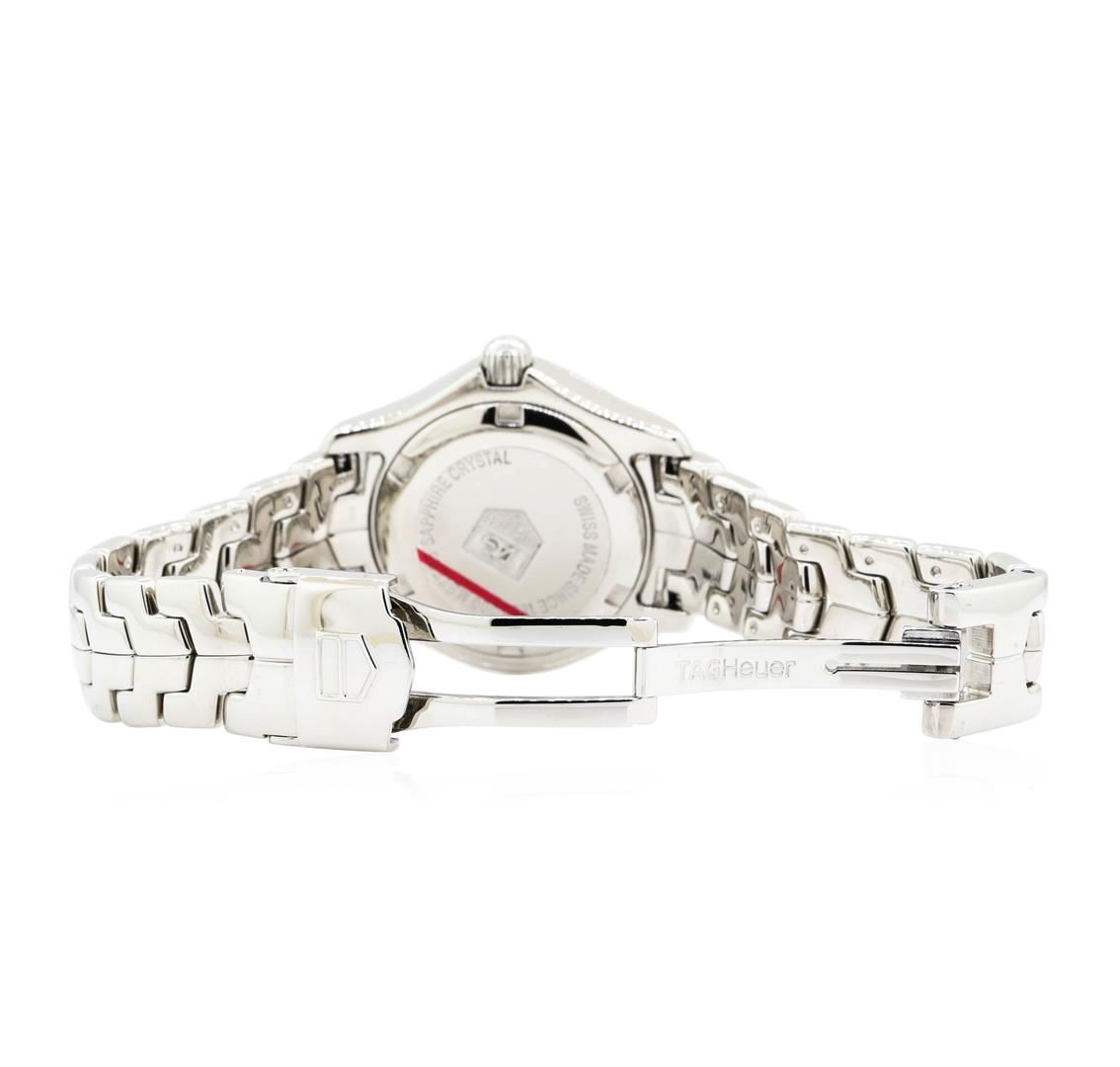 One Ladies, hand crafted and machine milled Tag Heuer round case Link wrist watch electronically tested stainless steel, Crown: screw-down, Bezel: bright polish, Crystal: synthetic sapphire, Movement: automatic, Dial: white mother of pearl with baton, parallel type hands and diamond marker numerals, Calendar: 3 o'clock, Bracelet: matching, Condition: G-6 extra fine.. Total Weight of Watch 59.80gm. GAS Appraised.