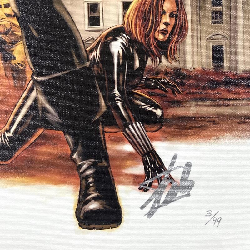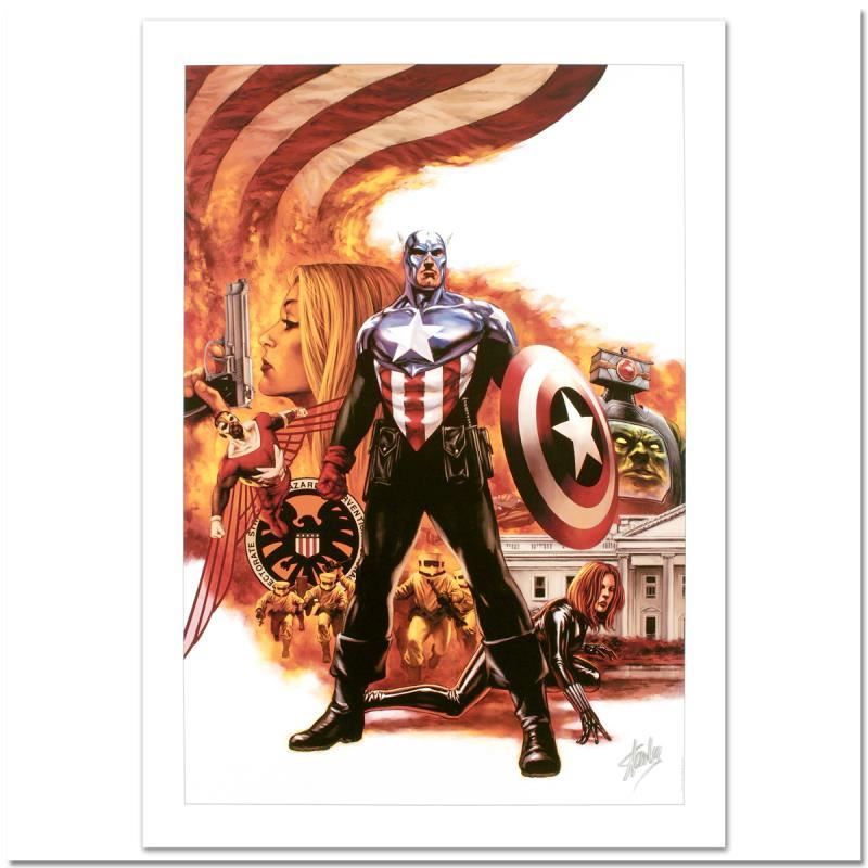 "Captain America #41" is a limited edition giclee on canvas with art by Steve Epting. Officially licensed by Marvel, this piece is numbered 3/99 and hand signed by creative legend Stan Lee (1922-2018). The piece comes with a certificate of authenticity. Measures approximately 27" x 18".